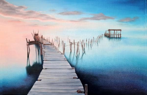 Oil on canvas, 40 x 50cm. One of the most photogenic places on the coast of Portugal. It is a masterpiece of folk architecture and the current piers were built sometime between the 1950s and 1960s, intended for the fishing boats that can dock there.